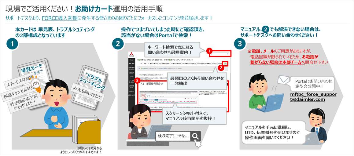 日々操作でお困りのシーンでは、マニュアル/FORCE Portalと併せて活用ください!