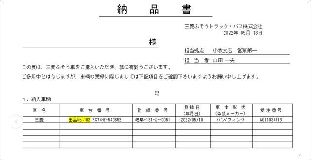 →ふそう入札会のケースで納品書、車両受領書に出品番号が表示されるようになります。