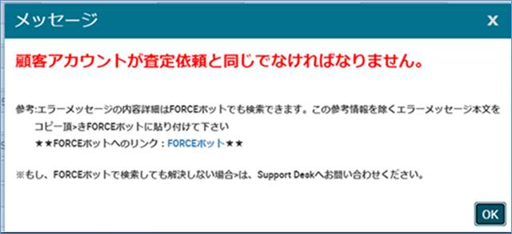 新車の納車完了承認時など、下記のエラーメッセージが出た場合は査定依頼の顧客の変更を中古車課へ依頼してください
