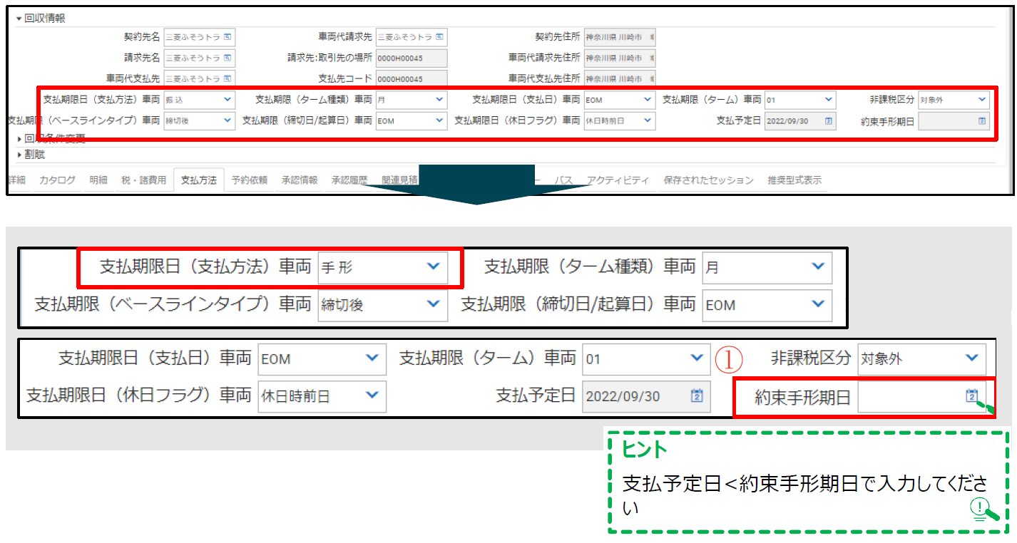 見積を改訂していただき、手形期日を入力してください。納車完了承認時にもチェックが入るので登録前までに必ずご入力いただくようお願いいたします。