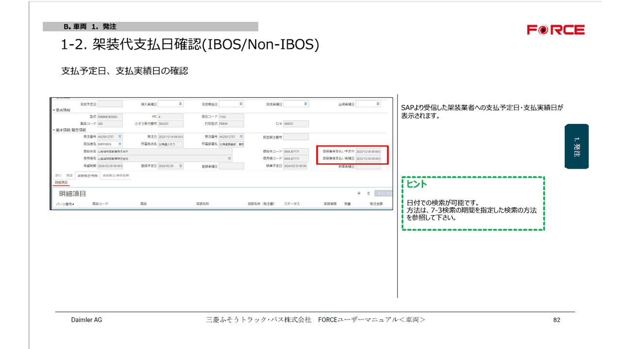 架装オーダー画面に、架装代の支払予定日及び支払実績日が表示されるようになります。