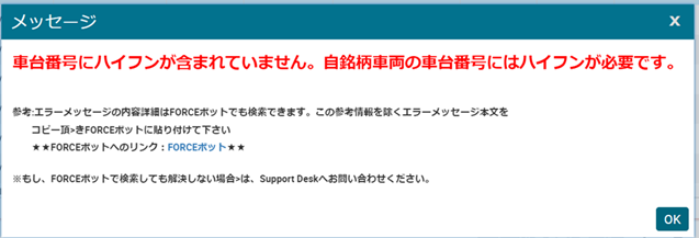 CRMに関連して順次データー精度を上げる目的で、車台番号に‘-’(ハイフン)有・無の重複を防ぐ為、車台番号の項目にチェックが入ります。