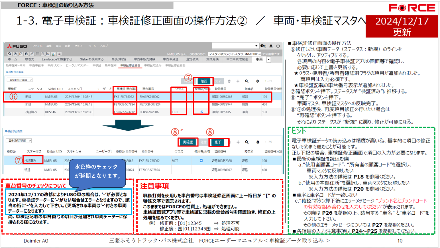 車検証修正画面に取込んだデーターがFUSO車両で、車台番号に‘-’が無い場合は該当箇所に‘-’を入れて下さい。