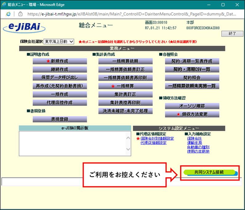 本日よりe-JiBAi総合メニューの右下に共同システム接続のボタンが追加されております。