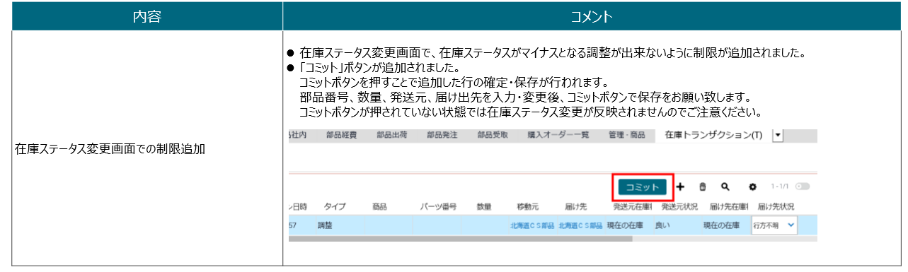 コミットボタンが押されていない状態では在庫ステータス変更が反映されませんのでご注意ください。