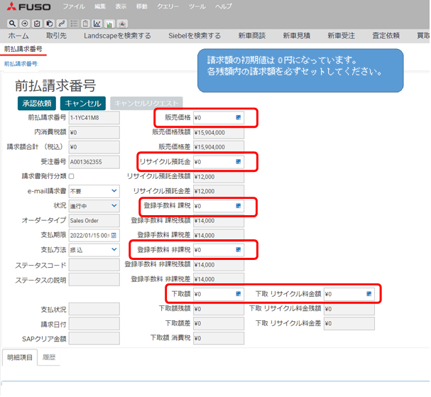 前払請求書の請求額の初期値が0円の為、そのまま0円で前払請求書の承認を送ってしまう。