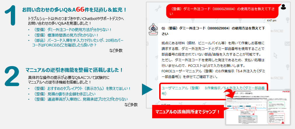 1月21日適用の機能改善リリースにあわせ、FORCEボットにて検索時に回答が未提示だったものを中心に改善を加え、検索性を向上させましたので、是非ご活用下さい。
