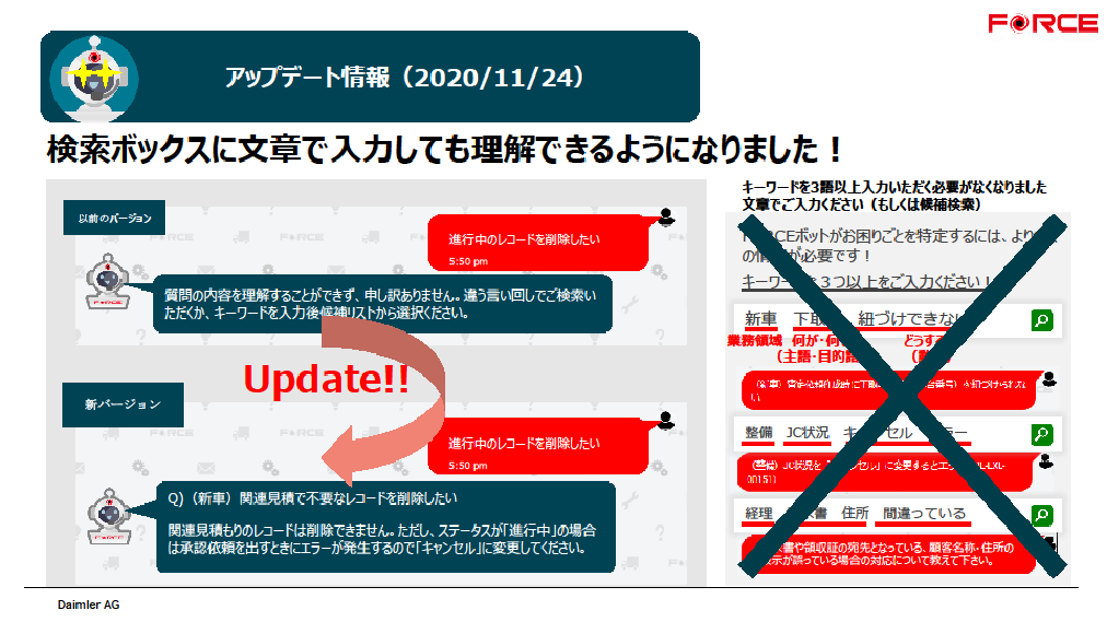 今回のアップデートでFORCEボットは検索ボックスに文章で入力しても理解できるようになりました。是非ご活用ください。
