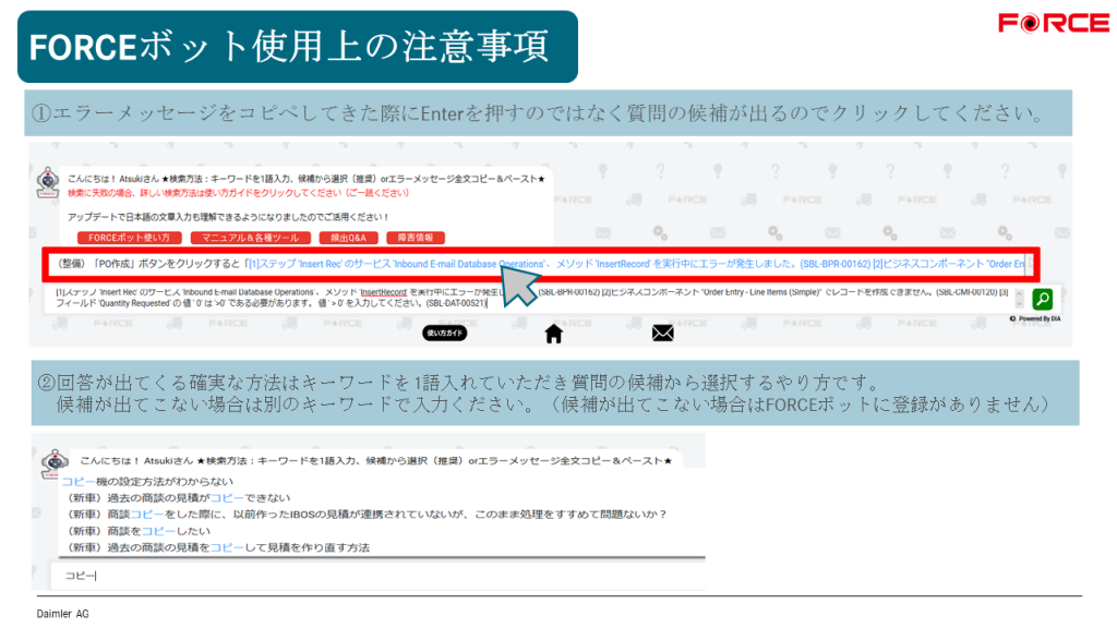 エラーが出た際にはエラーメッセージをコピー、FORCEボットの検索ボックスに貼り付けで検索をお願い致します。